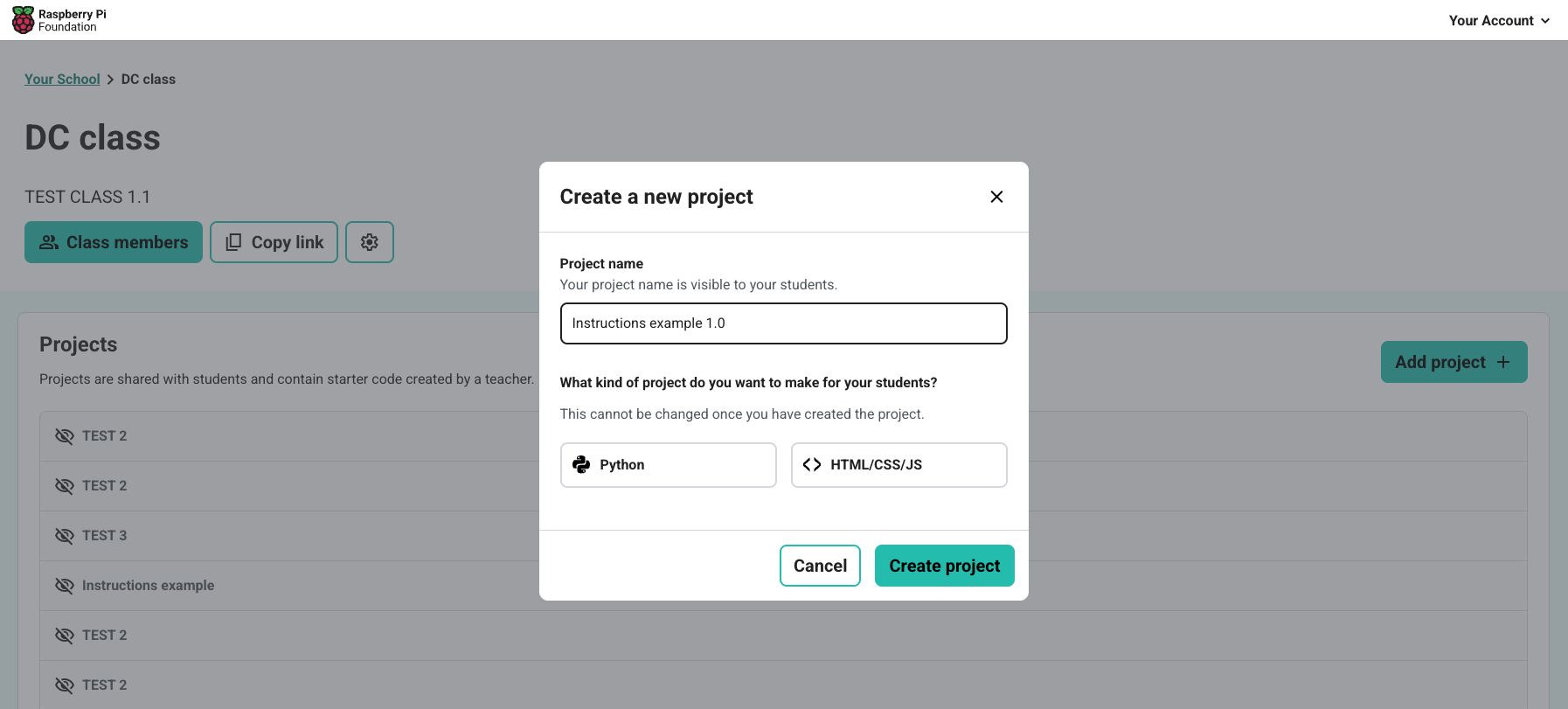 From an individual class page, click 'Add project' to get started. You'll need to give the project a title and a type - Python or HTML/CSS/JS.