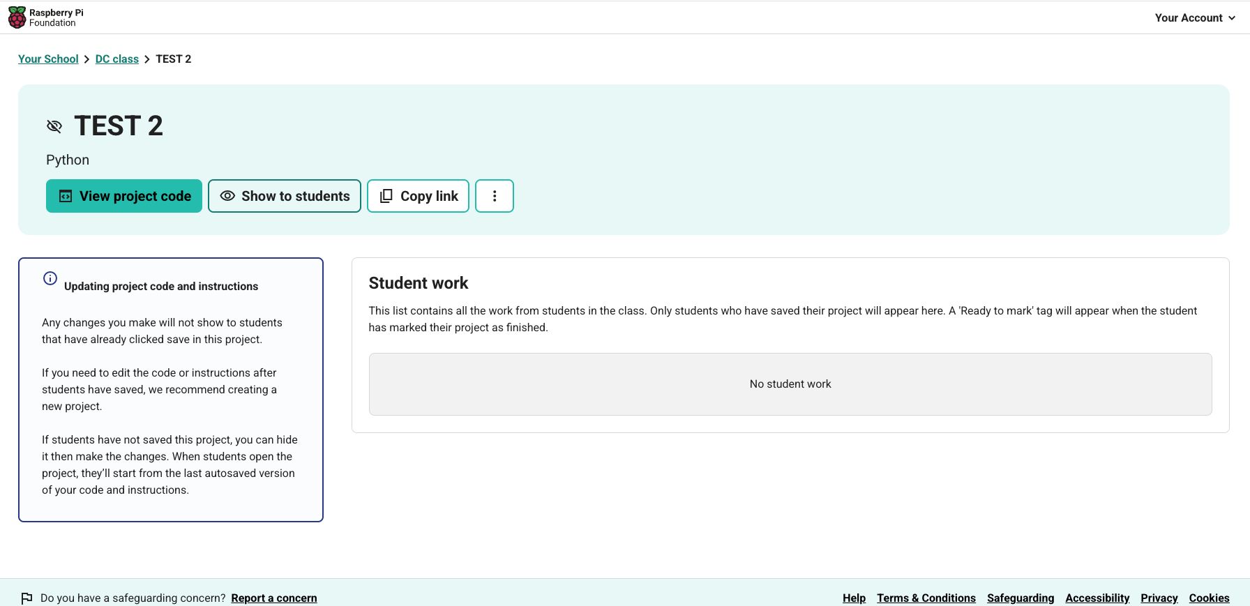 Once you have clicked 'Show to students', you can then share a direct link to this project with your students by clicking 'Copy link'. The link you have copied can be pasted in a document or email and then shared with students for easy access to a project. Once the students click the link, if they are not signed in, they will be prompted to provide their school code, username and password.
