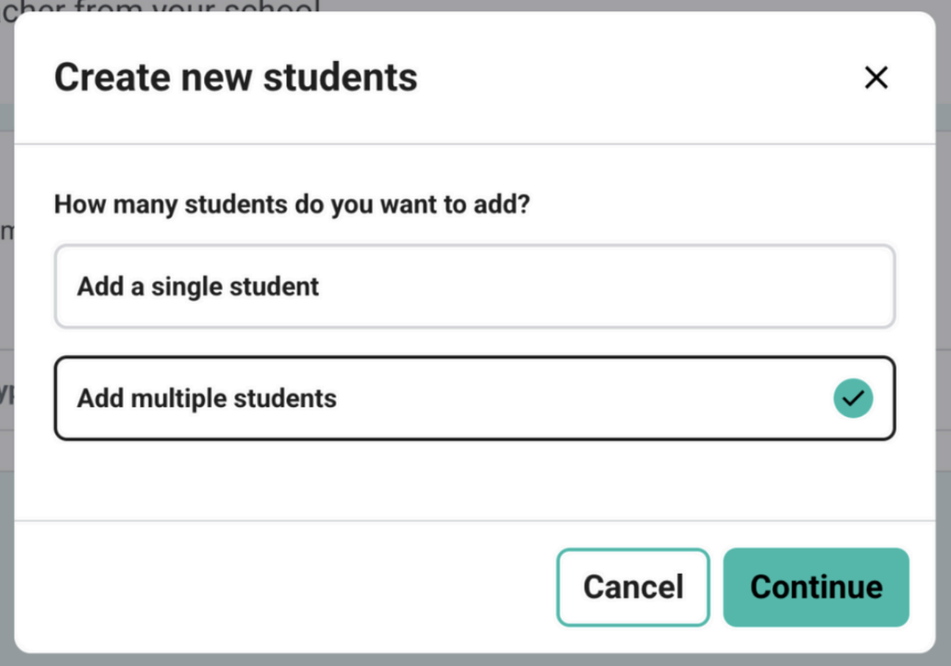 Click 'Add student' and choose from the option to add a single student or to add multiple students at once.