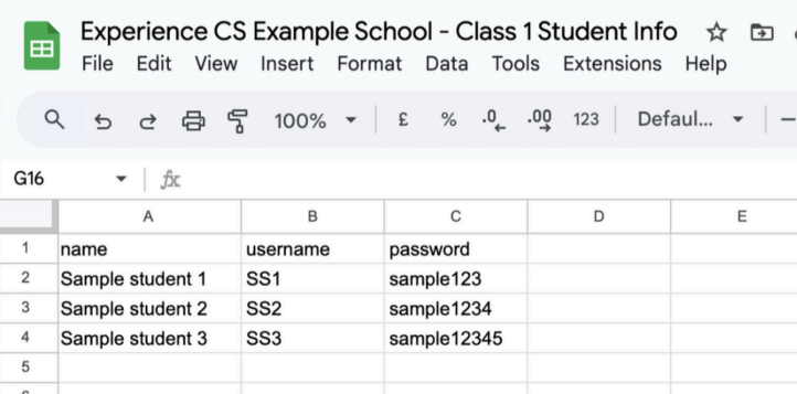 - You will need to upload a CSV file containing student names, usernames and passwords (please note that you can currently only perform 1 upload at a time per school).