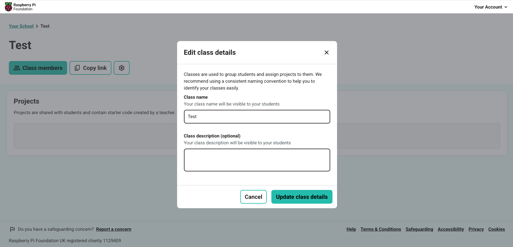Once you click the settings icon, you can update the class name. Once you are happy with the name, you can click 'Update class details'.