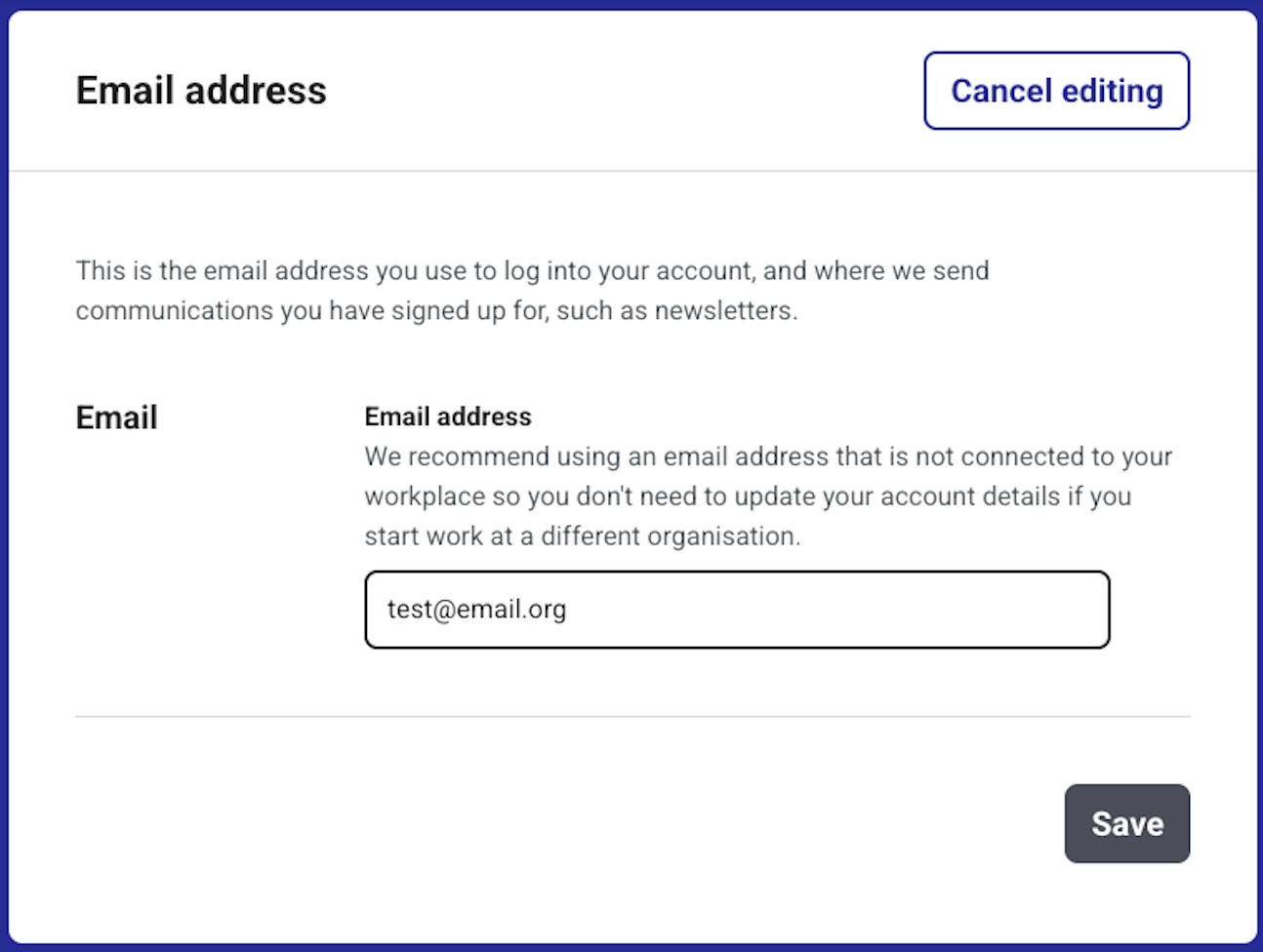 After you change your email address, click 'save' to confirm the change. Click 'Cancel editing' if you wish to cancel changing your email address.