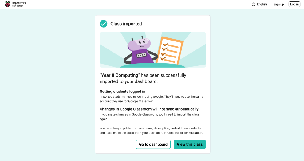 You will see a confirmation screen confirming the class that has been imported. You will have the option to go back to the school dashboard or the class itself.